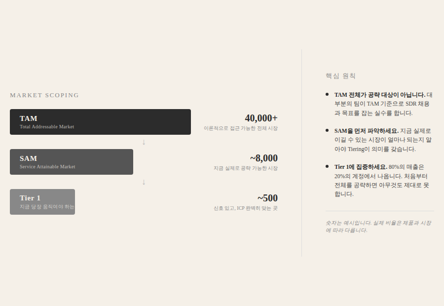 TAM과 SAM의 차이를 무시하고 SDR 채용 계획이나 아웃바운드 볼륨을 잡으면, 결국 Tier 3 회사들에 시간을 낭비하게 됩니다. SAM을 먼저 파악하고, 그 안에서 Tiering을 해야 리소스가 제대로 배분됩니다.