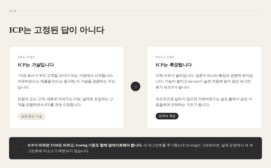 특히 Post-PMF 단계에서 TAM을 확장할 때 이 부분을 놓치는 경우가 많습니다. 새로운 세그먼트를 추가했지만, 실제 운영에서는 기존 ICP 기반의 Scoring이 그대로 작동하고 있어서 새 세그먼트에 충분한 리소스가 배분되지 않는 것입니다.
